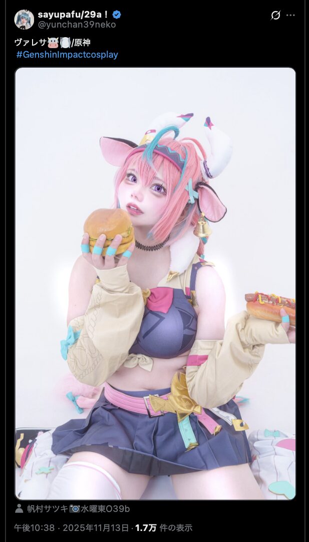 コスプレイヤーの猫目さゆさんが11月13日、人気ゲーム『原神』のキャラクター【ヴァレサ】のコスプレ写真をXで投稿しました。