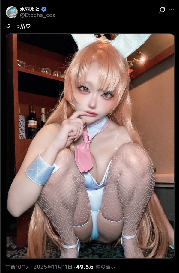 コスプレイヤーの水羽えとさんが11月11日、人気アニメ『ソードアート・オンライン』のアスナのバニーガール姿の写真をXで投稿しました。