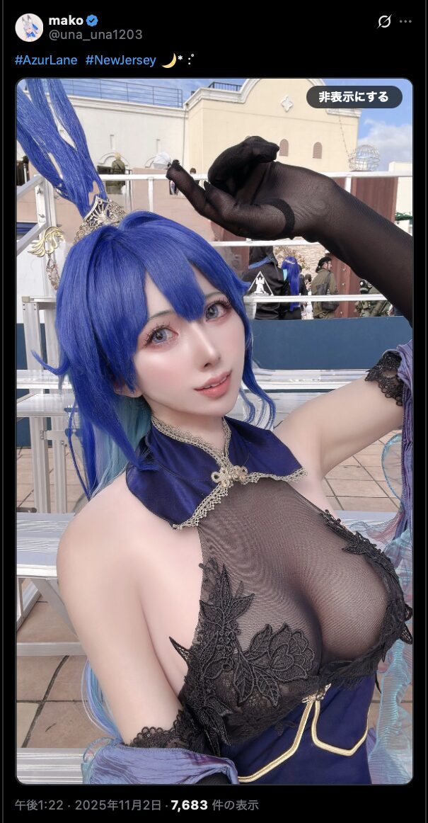 コスプレイヤーのmakoさんが11月2日、人気スマートフォンゲーム『アズールレーン』のキャラクター【ニュージャージー】のコスプレ写真をXで投稿しました。