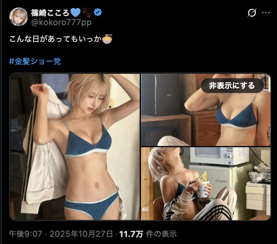 モデル・DJ・コスプレイヤー・グラビアアイドルの篠崎こころさんが10月27日、「こんな日があってもいっか」というコメントとともに、自宅でのリラックスした姿をXで投稿しました。