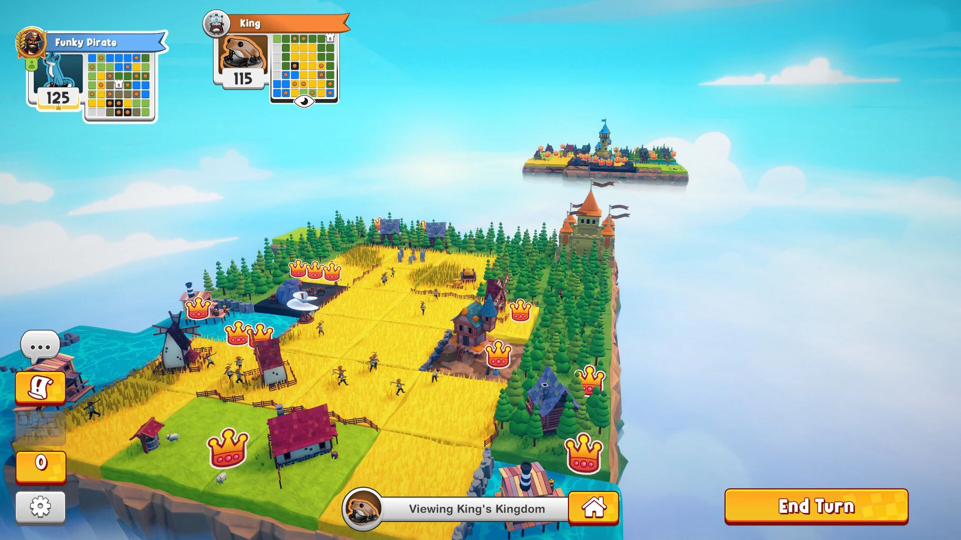 他のプレイヤーの王国も詳細に観察でき、それぞれの戦略や美的センスが反映された個性豊かな領地を眺める楽しさもあります。ミニチュア模型のような温かみのある表現は、ボードゲームの魅力をデジタルで見事に再現しています。