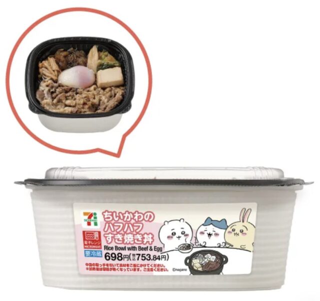 ちいかわが当選したすき焼きセットをイメージした商品。甘じょっぱく味付けした牛肉と野菜をふんわり煮込み、仕上げに温泉玉子をのせているとのことです。