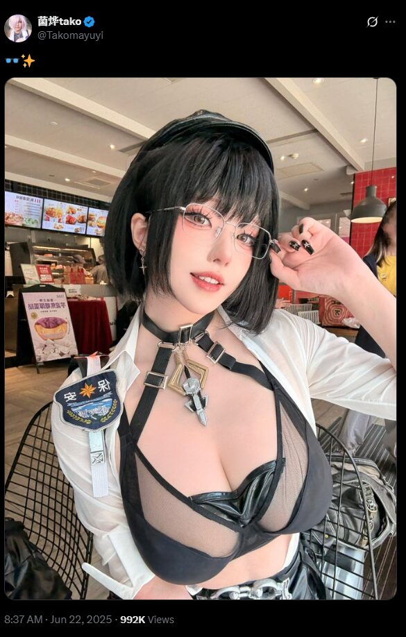 中国人コスプレイヤーの菌烨takoさんが6月22日、警備員風の制服を着た写真をXで投稿しました。
