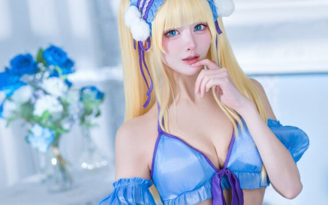 金髪のロングヘアウィッグにとがった耳が特徴的で、まさにファンタジー作品に登場するエルフそのもの。白いニーハイソックスとガーターベルトの組み合わせが、エルフの上品さにセクシーさをくわえています。