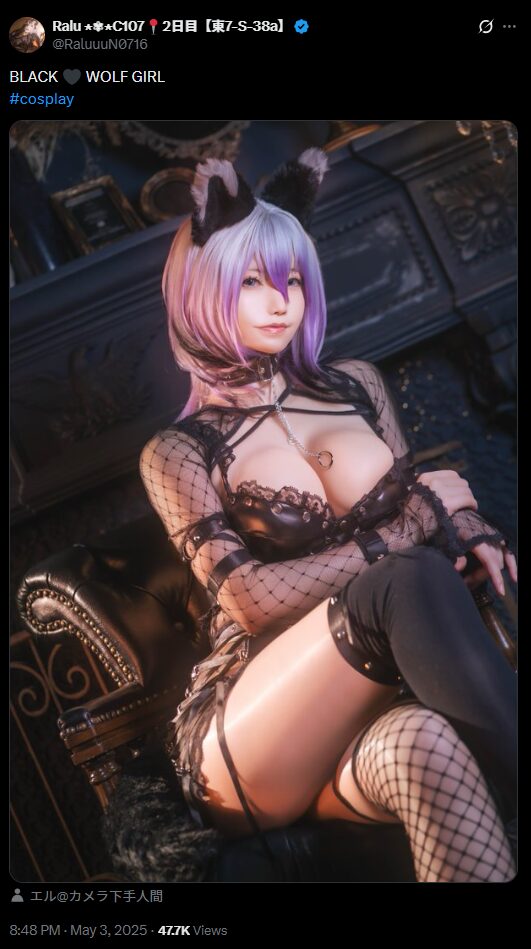 コスプレイヤーのRaluさんが5月3日、「BLACK WOLF GIRL #cosplay」というコメントとともにセクシーなオオカミ娘のコスプレ写真をXで投稿しました。