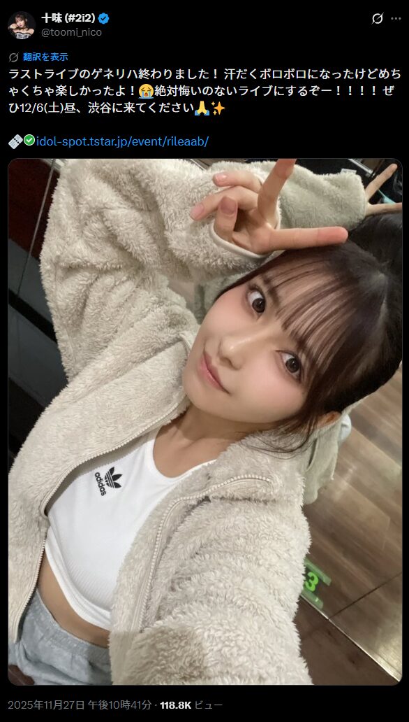 アイドルグループ#2i2の十味さんが11月27日、ラストライブのゲネプロ(最終リハーサル)終了後の写真をXで投稿しました。