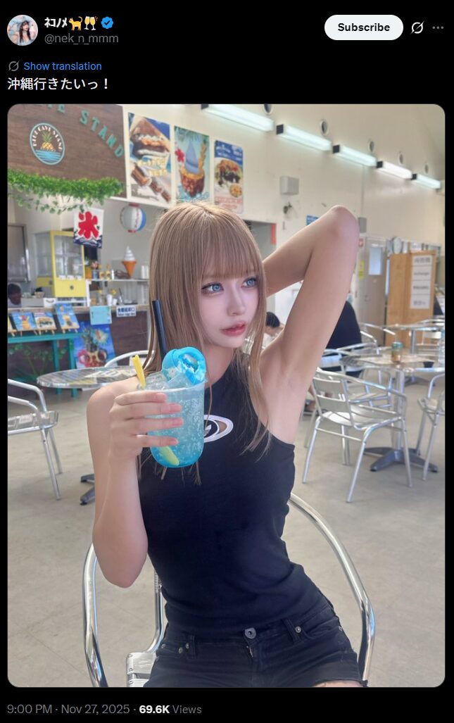 コスプレイヤーのネコノメさんが11月27日、「沖縄行きたいっ!」というコメントとともに、カフェでの写真をXで投稿しました。