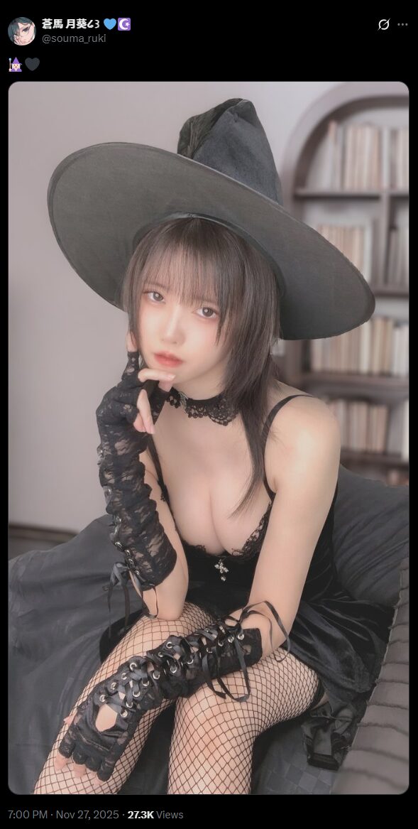 コスプレイヤーの蒼馬月葵さんが11月27日、魔女をイメージした黒のワンピース姿の写真をXで投稿しました。
