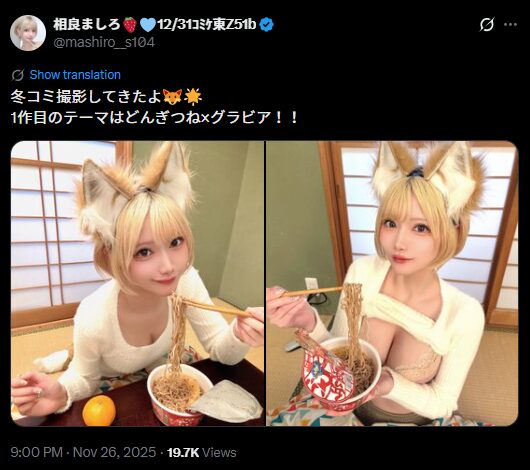 相良ましろさんは「冬コミ撮影してきたよ 1作目のテーマはどんぎつね×グラビア!!」とコメント。どんぎつねとグラビアを組み合わせた斬新なコンセプトが話題を呼んでいます。