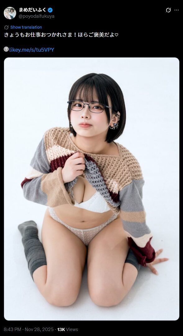 まめだいふくさんが11月28日、「きょうもお仕事おつかれさま!ほらご褒美だよ♡」というコメントとともに、メガネ姿の写真をXで投稿しました。