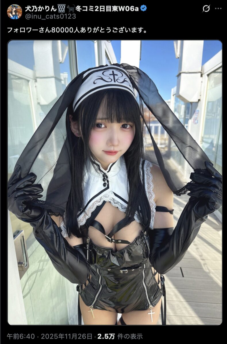コスプレイヤーの犬乃かりんさんが11月26日、フォロワー8万人達成を報告する写真をXで投稿しました。