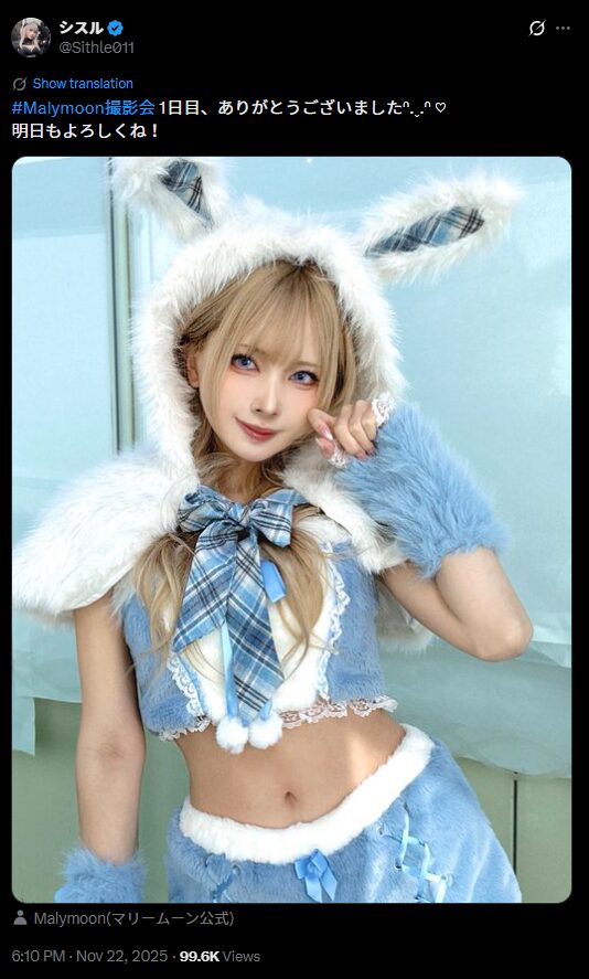 コスプレイヤーのシスルさんが11月22日、Malymoon(マリームーン公式)撮影会1日目の写真をXで投稿しました。