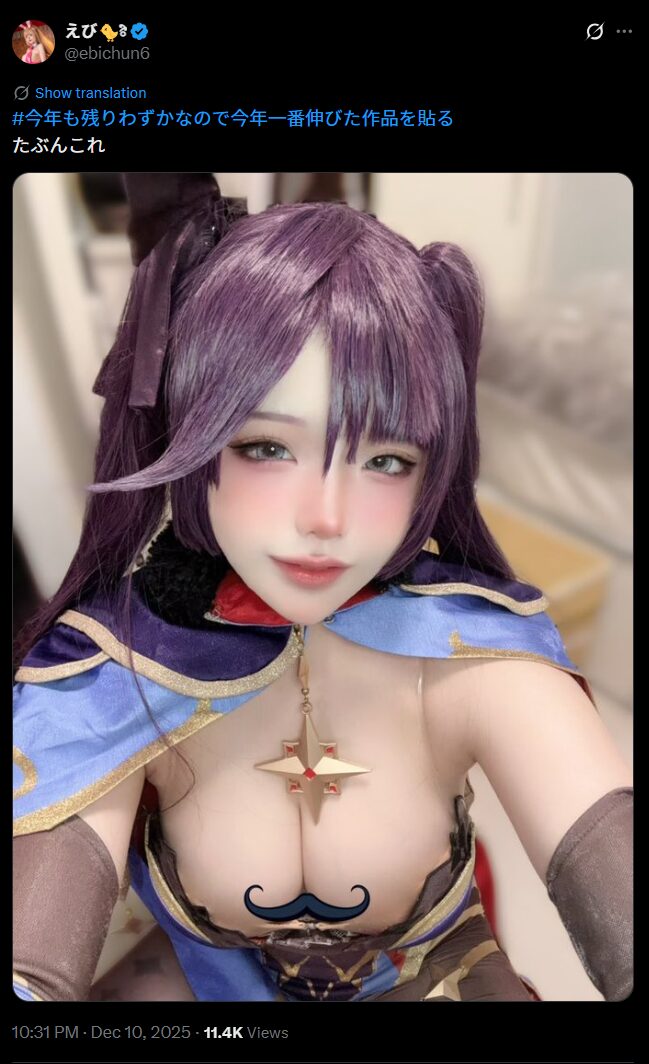 コスプレイヤーのえびさんが12月10日、「#今年も残りわずかなので今年一番伸びた作品を貼る たぶんこれ」というコメントとともに、人気ゲーム『原神』のモナのコスプレ写真をXで投稿しました。