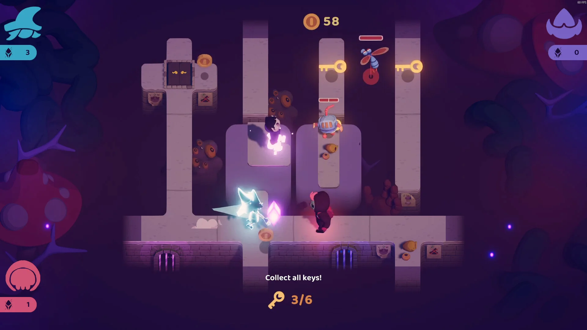 ゲームプレイでは、プレイヤーキャラクターとして個性豊かな4体のキャラクターから選択可能です。骸骨の戦士や魔女、スライムのような愛らしいキャラクターなど、ファンタジーの定番要素をポップにアレンジしたデザインが採用されています。