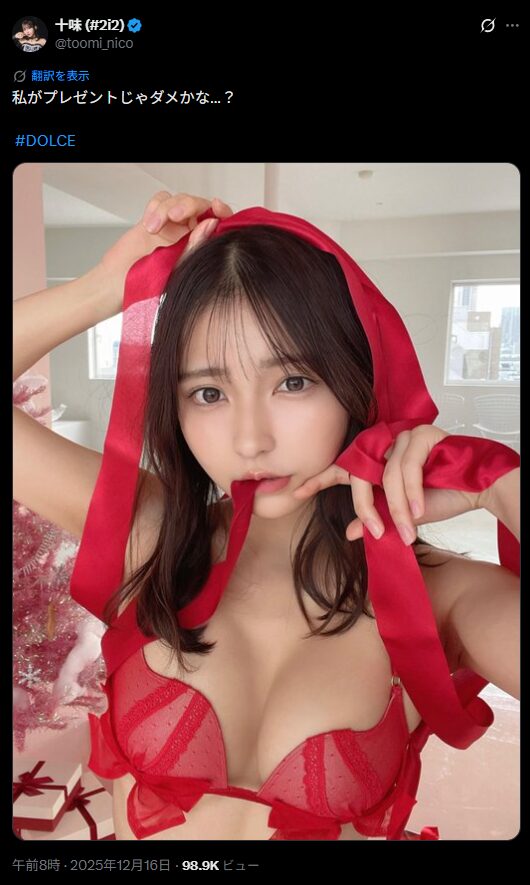 アイドルグループ【#2i2】の十味さんが12月16日、クリスマス企画として赤いランジェリー姿の写真をXで投稿しました。
