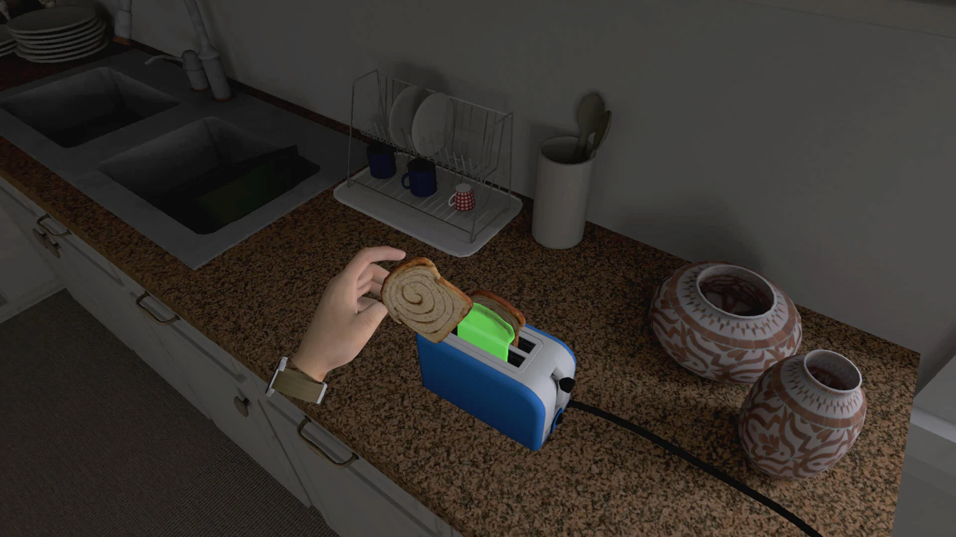 本作の魅力は電気工事だけではありません。広々としたリビングルームやキッチン、ガレージなど、細部まで作り込まれた生活空間が用意されています。レトロなラジオを操作したり、レコードプレイヤーで音楽を楽しんだり、ソファでテレビを見てくつろいだり。ダーツで遊んだり、トースターでパンを焼いたりと、日常生活のさまざまな場面をVRで体験できます。