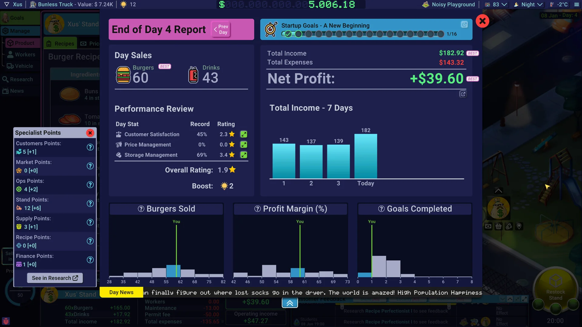 1日の終わりには詳細な経営レポートが表示され、売上、純利益、顧客満足度、価格管理、在庫管理などが星の数で評価されます。過去数日間の推移もグラフで確認でき、どこを改善すべきか一目で把握できます。データに基づいた分析と改善のサイクルが、経営ゲームとしての深みを生み出しています。