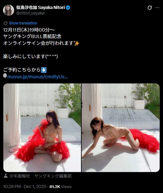グラビアアイドルの似鳥沙也加さんが12月1日、ヤングキングBULL表紙記念のオンラインサイン会開催をXで発表しました。