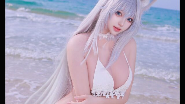 まさに現実の信濃! 小新、『アズールレーン』信濃のビーチコスプレで魅惑的なポージング