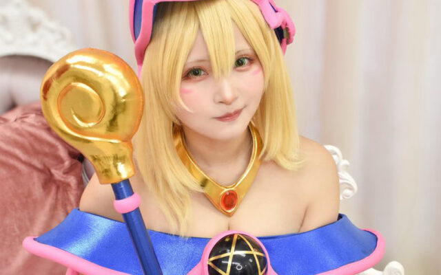 鮮やかなピンク×ブルーが映える! 天音ありぃ、『遊戯王』ブラック・マジシャン・ガールのコスプレを披露