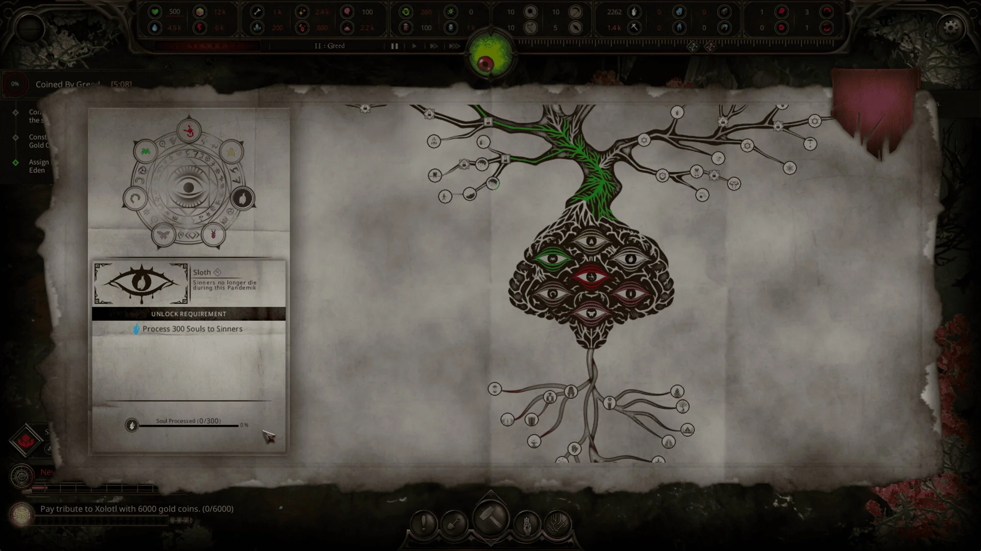 各スキルには特定のアンロック条件が設定されており、たとえば「Sloth」というスキルは「300の魂を罪人に変換する」ことで解放されます。古びた羊皮紙のようなテクスチャで表現されたスキルツリー画面は、まるで古代の魔導書を読んでいるような神秘的な雰囲気を醸し出しています。キャラクターや拠点を強化していく過程は、長時間のプレイを支える重要な要素となっています。