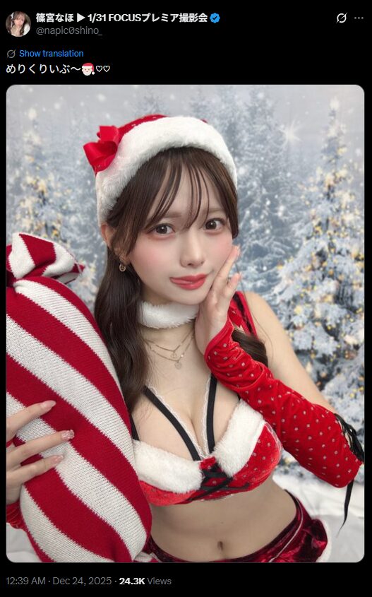 グラビアアイドルの篠宮なほさんが12月24日、クリスマスイブに合わせてサンタクロースのコスプレ写真をXで投稿しました。