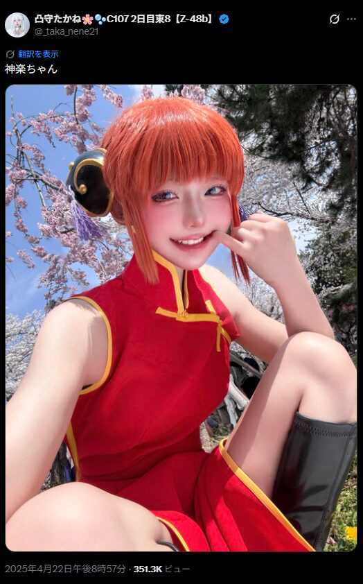 ファンからは「おぉ!!久しぶりの神楽ちゃんめちゃ可愛いです!!! お顔の表情がもう神楽ちゃん本人って言えるくらい再現度が高く感じます。😽」、「昔の神楽コスとは違う可愛さがある‼️😭これも成長というのだろうか…すごくメロい🩷🩷🩷」、「腕ほっっっそ!!!!3年前よりパワーアップしてる…😭そりゃそうだ、毎日可愛いを更新してるたかね様だもん」、「久しぶりのたかねちゃんの神楽最高に好き!! 天才すぎる!!」といったコメントが寄せられていました。