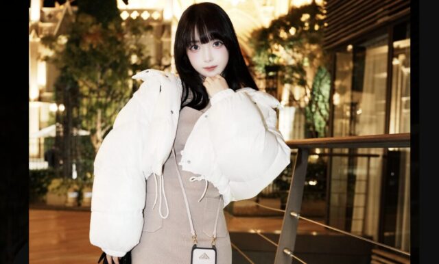 ベージュのセミロングヘアに前髪がそろった髪型も、スクールガール感をより一層引き立てており、まるでアニメから飛び出してきたようなビジュアルです。