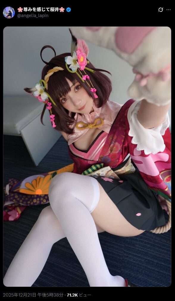 コスプレイヤーの尊みを感じて桜井さんが12月21日、人気オンライン麻雀ゲーム『雀魂(じゃんたま)』のメインヒロイン「一姫」のコスプレ写真をXで投稿しました。