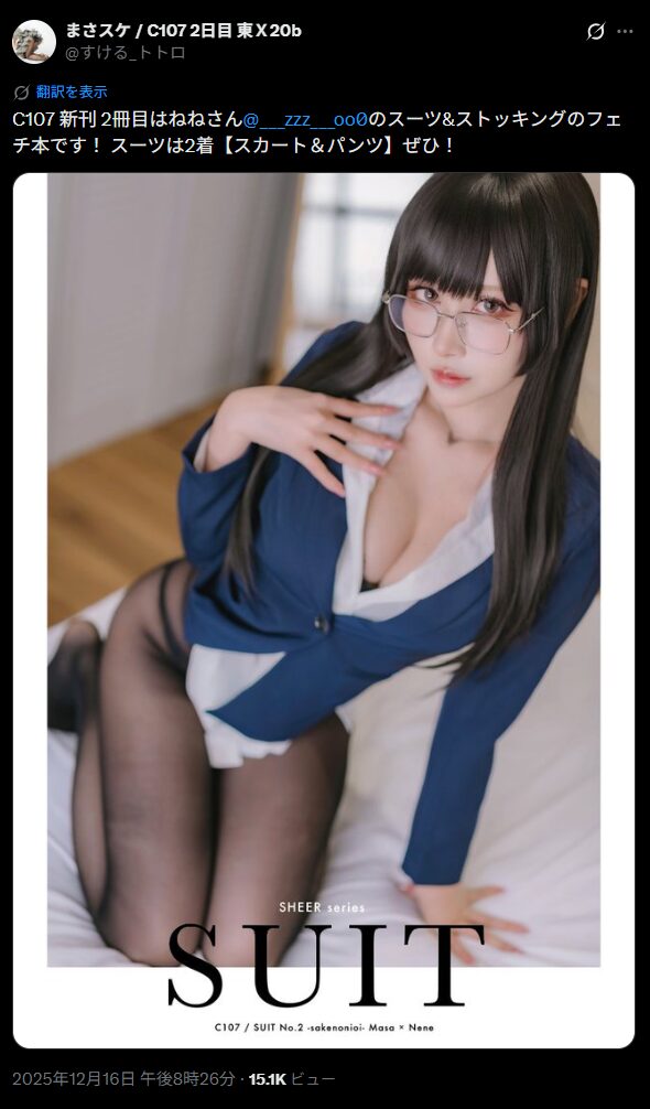 カメラマンのまさスケさんが12月16日、コスプレイヤーであるねねさんのセクシーなスーツ&ストッキング姿の写真をXで投稿しました。