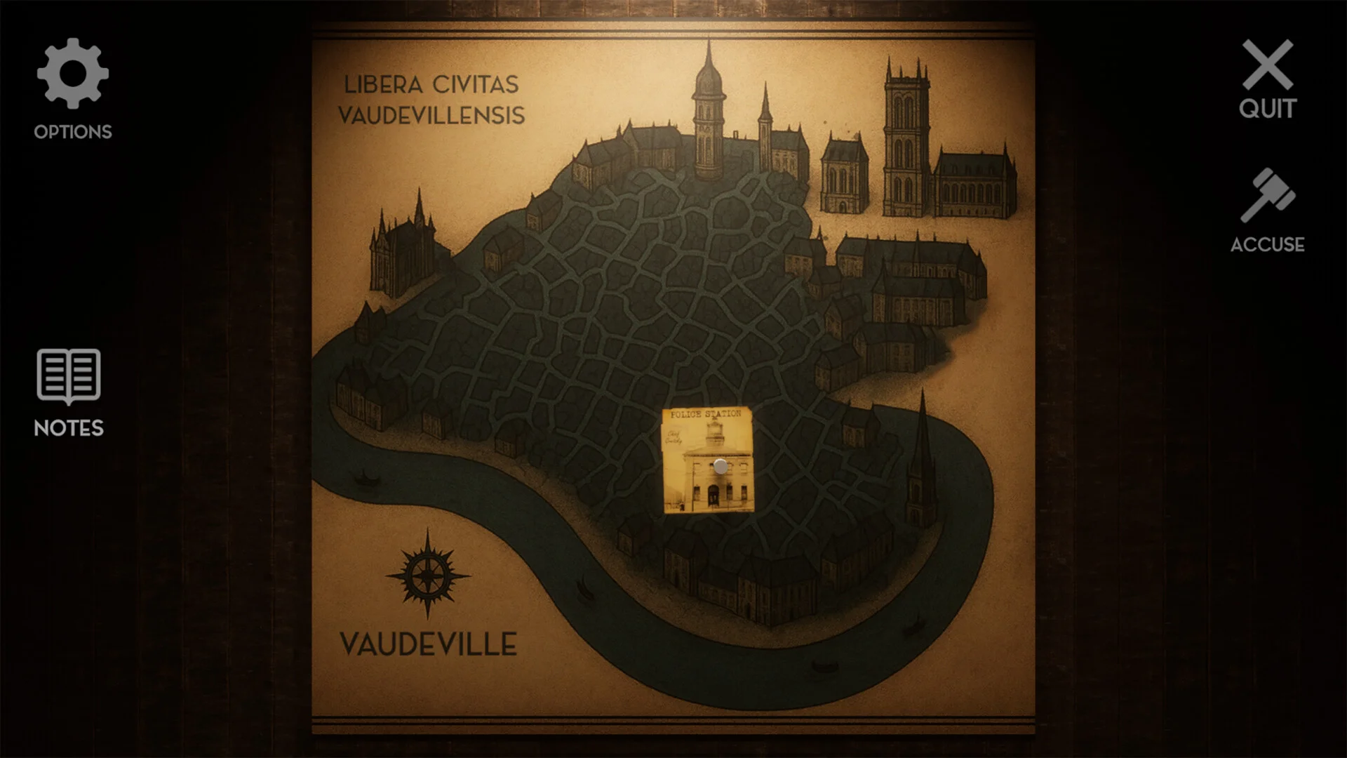 ゲームの舞台となるヴォードヴィル市は、古地図のようなデザインのマップで表現されています。魅惑的なカバン・ヴィオレット、混沌としたサーカス・サクサバ、不気味なほど美しいグレイヴセン邸、ミステリアスな荒野ブラックウッズなど、個性豊かなロケーションを自由に探索できます。