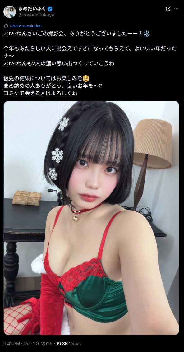 コスプレイヤーのまめだいふくさんが12月20日、2025年最後の撮影会の報告とともに、セクシーなクリスマス衣装の写真をXで投稿しました。