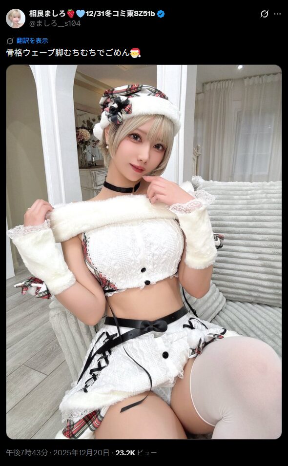 2.7次元グラビア・コスプレイヤーの相良ましろさんが12月20日、「骨格ウェーブ脚むちむちでごめん」というコメントとともに白いレース衣装姿の写真をXで投稿しました。