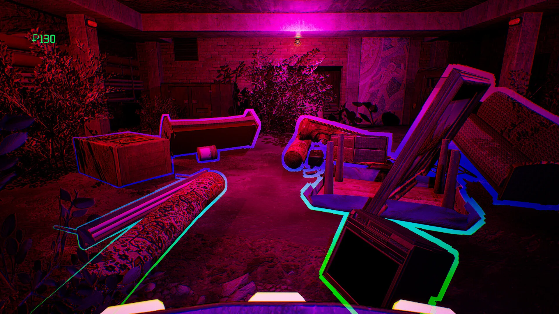 本作のビジュアルには、いくつかの印象的な特徴があります。通常時はリアルな質感表現により、金属の錆や段ボールのくたびれ具合まで丁寧に描かれています。一方で、特定の状況下では重要なオブジェクトがネオンカラーの輪郭で強調され、サイケデリックな雰囲気を醸し出すことも。この独特の視覚エフェクトは、プレイヤーに必要な情報を分かりやすく提供しつつ、ゲームならではの非現実的な美的感覚を創出しています。