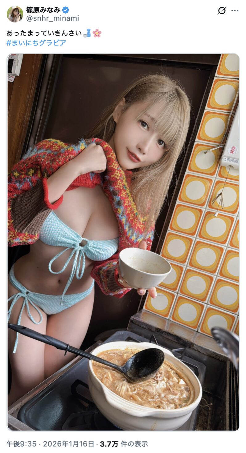 グラビアアイドルの篠原みなみさんが1月16日、「あったまっていきんさい」というコメントとともに、お鍋を作る写真をXで投稿しました。
