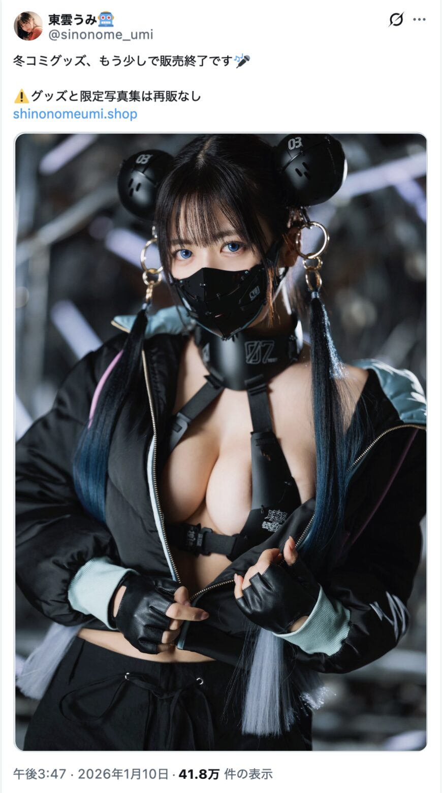 このセクシーかつクールな衣装にファンからは「闇の東雲、クールで美しいです。早く冬コミセット、見たいです」、「闇のうみちゃん美しすぎ このコスプレ神!! グッズ急いで買わなきゃ…特盛ゲットする!!」、「可愛くてセクシーで格好良い これは買わなきゃ」、「even the face mask looks so cool, idol…(マスクさえもクールに見える、アイドル…)」といったコメントが寄せられていました。