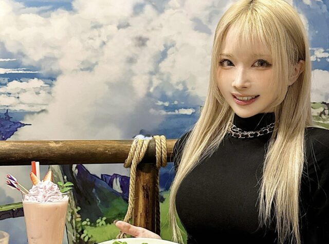髪は金髪のツインテール風にスタイリングされ、頭部には大きなピンクのリボンヘッドアクセサリーを装着。そしてぬいぐるみも一緒に持つという徹底ぶりです。