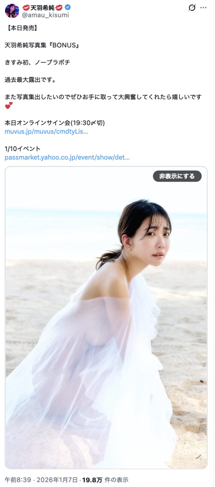 今回の写真集『BONUS』では、天羽希純さん初となる「ノーブラポチ」を披露。本人も「過去最大露出」とコメントしており、ファンにとっては見逃せない一冊となっています。
