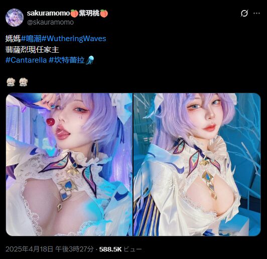 中国人コスプレイヤーの紫玥桃さんが4月18日、人気ゲーム『鳴潮』のキャラクター「カンタレラ」のコスプレ写真をXで投稿しました。