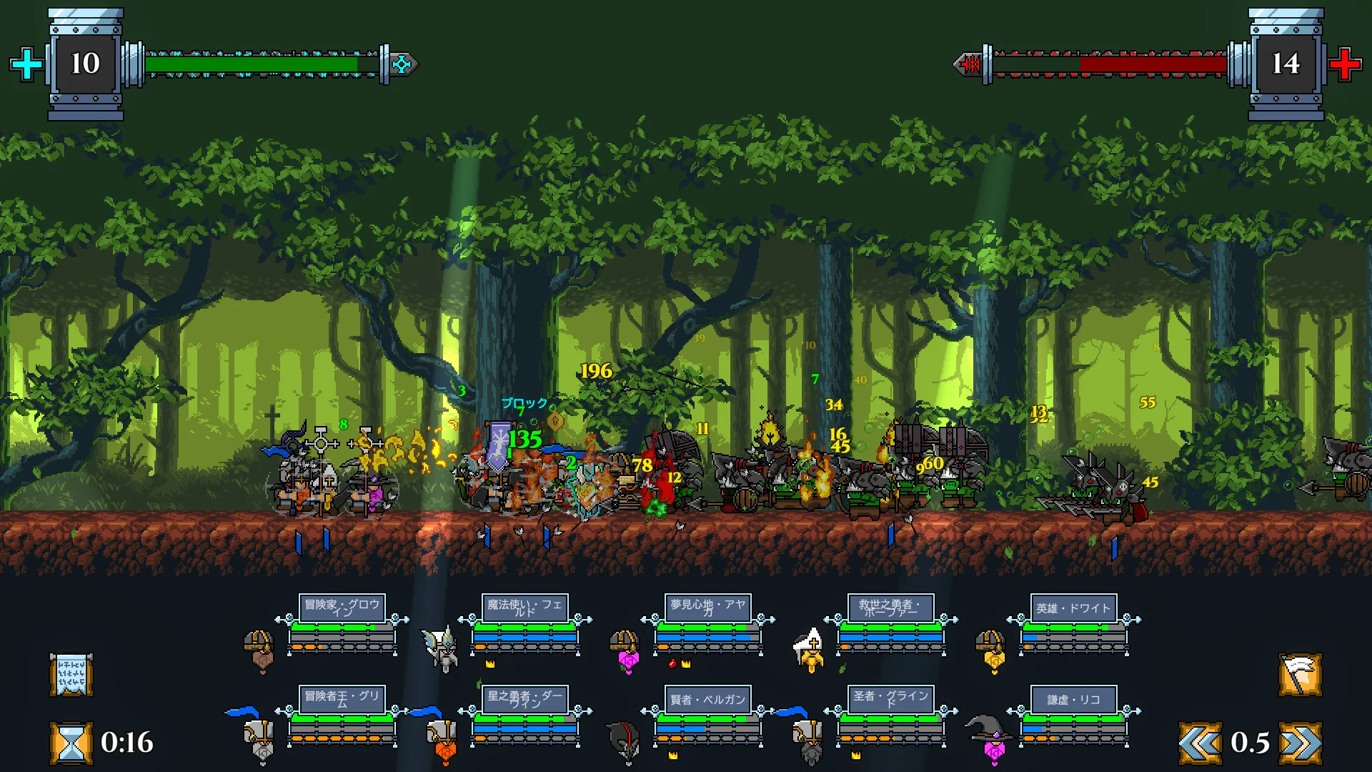 ピクセルアートで描かれたドワーフたちが、画面狭しと入り乱れて戦う様子は圧巻です。深緑の森、白銀の雪山、荒涼とした荒野など、さまざまなステージが用意されており、それぞれ異なる雰囲気の中で戦闘が展開されます。ダメージや回復の数字が飛び交い、両陣営のライフバーが刻々と変化する様子を眺めているだけでも、戦況の激しさが伝わってきます。