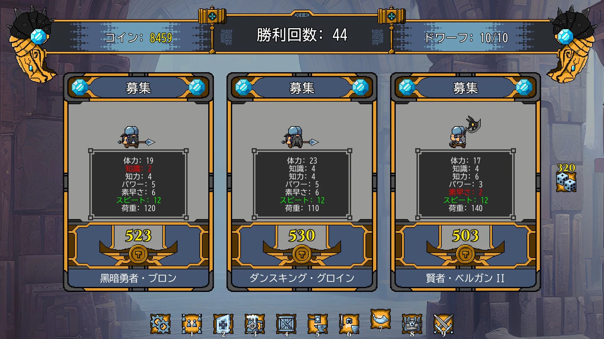 本作には多数のユニークなドワーフたちが登場します。「闇黒勇者・ブロン」や「ダンスキング・グロイン」といった個性的な名前を持つ彼らは、体力、知識、パワー、素早さ、荷物といった詳細なステータスを備えています。募集画面では複数のキャラクターから選択でき、それぞれのステータスを見比べながら、自分の戦略に合った仲間を選ぶ楽しさがあります。
