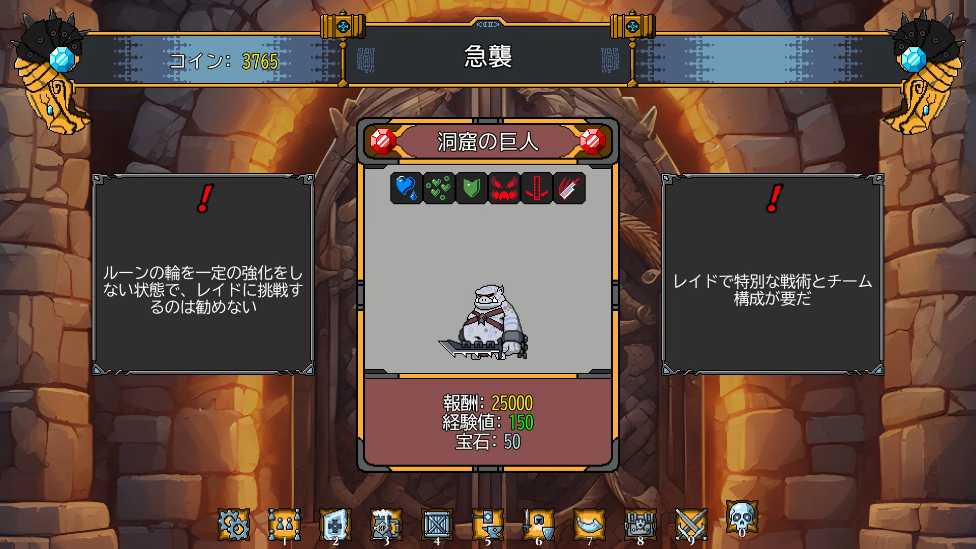 50回のバトルに勝利すると、「急襲」という特別なコンテンツが解放されます。このモードでは「洞窟の巨人」といった強力なボスキャラクターに挑戦でき、クリアすると大量の経験値や宝石といった豪華な報酬が手に入ります。ただし、ボス戦は通常のバトルよりも難易度が高く、特別な戦術とチーム構成が求められます。ルーンの輪を活用してしっかり強化してから挑むのがおすすめです。
