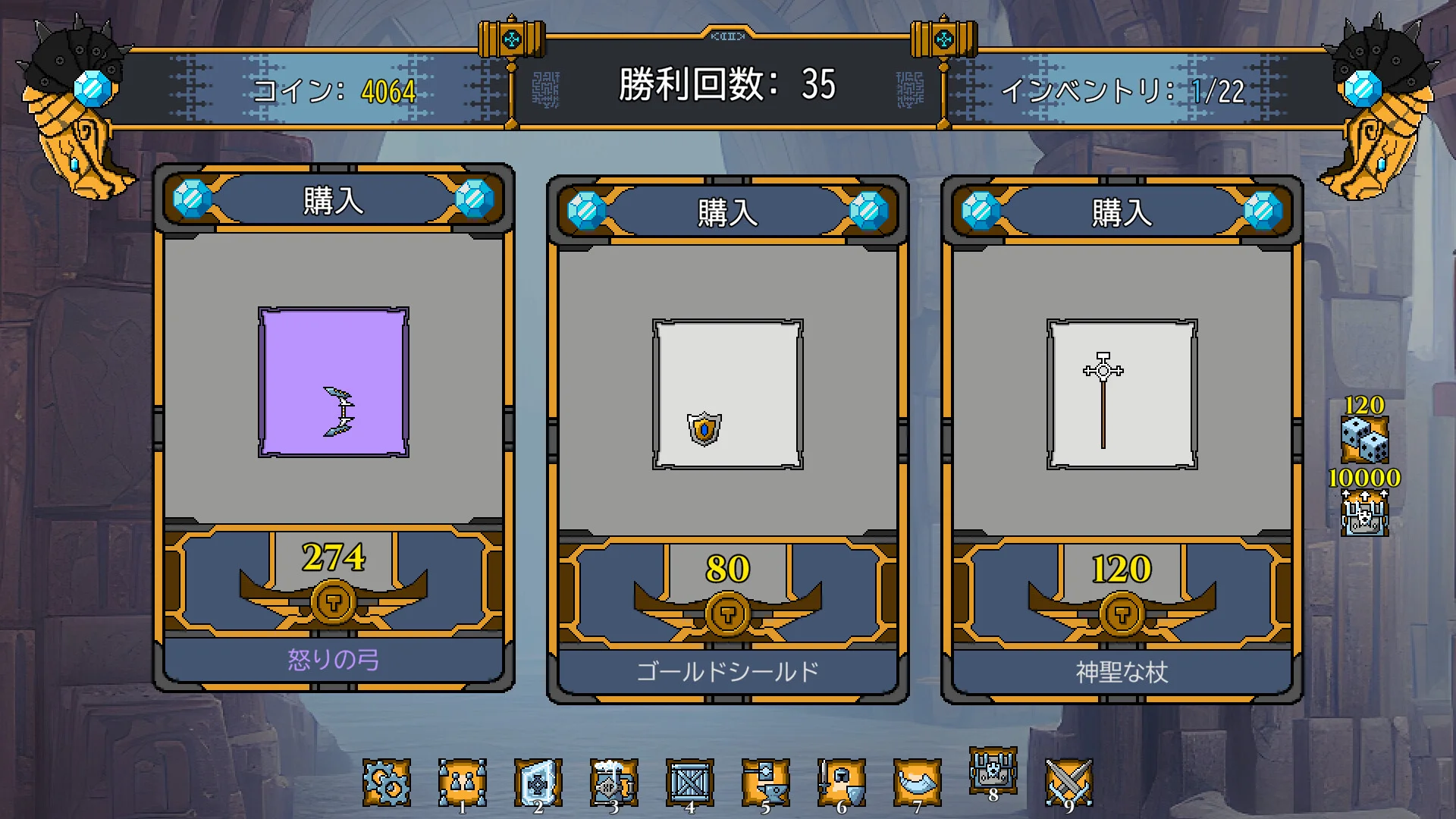 獲得したキャラクターはレベルアップさせることができ、武器や防具を装備させることで、さらに強化できます。インベントリ画面では、手に入れたキャラクターやアイテムを管理し、最大10人のドワーフで構成される部隊をカスタマイズ可能です。 杖、弓、盾といった多彩な装備品を集め、それぞれのドワーフに最適な装備を与えることで、戦闘力を大幅に向上させられます。