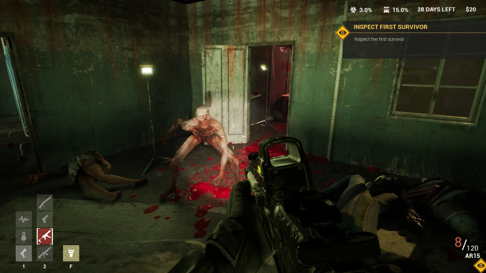 本作の特徴的なシステムは、拠点建設を排除し、生存者の検査と銃撃戦に焦点を当てている点です。検問所にやってくる生存者に対して、詳細なチェックリストに基づいた検査をおこないます。体温測定や目の状態、皮膚の変化、呼吸、健康状態、所持品まで、あらゆる要素を確認しながら感染の兆候を見逃さないよう注意を払う必要があります。鼻血を出している生存者や、わずかな体温の変化も見逃せません。変異前に感染者を発見できなければ、取り返しのつかない事態を招くでしょう。