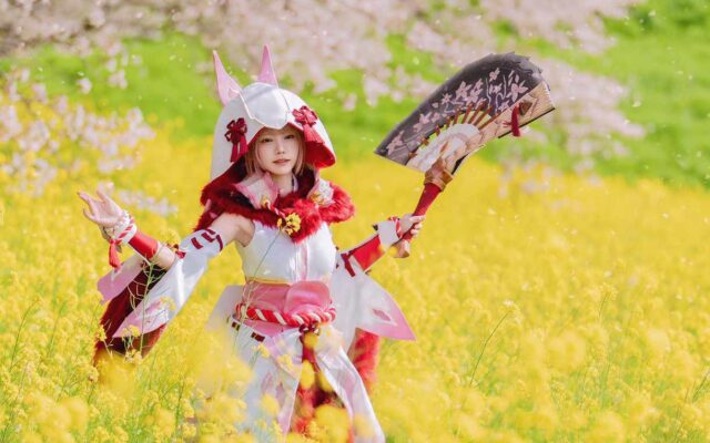 春爛漫! えなこ、『モンスターハンター』タマミツネ装備のコスプレで桜と菜の花に包まれる