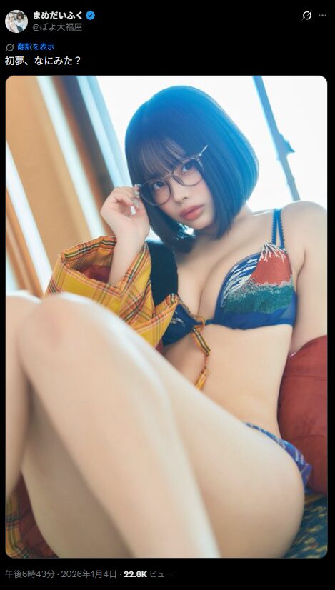 コスプレイヤー・グラビアアイドルのまめだいふくさんが1月4日、「初夢、なにみた?」というコメントとともに、眼鏡姿の魅力的な写真をXで投稿しました。