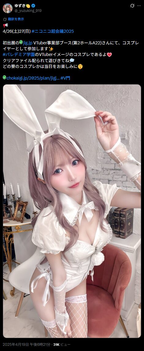 コスプレイヤー・コンパニオン・モデルのゆずきさんが4月19日、『ニコニコ超会議2025』に初出展することを白いバニーガール姿でXで発表しました。