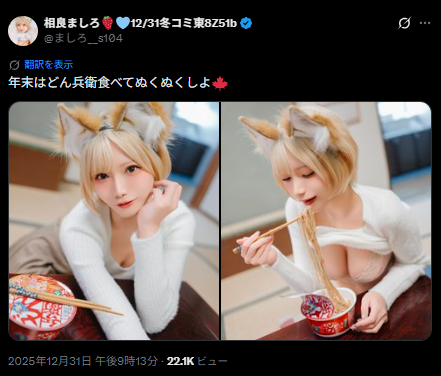 コスプレイヤー・グラビアアイドルの相良ましろさんが12月31日、可愛らしい狐耳をつけてどん兵衛を食べる写真をXで投稿しました。