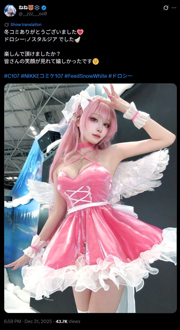 コスプレイヤーのねねさんが12月31日、冬コミケ107での『勝利の女神:NIKKE』のキャラクター【ドロシー】のコスプレ写真をXで投稿しました。