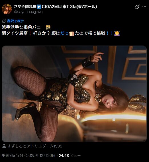 コスプレイヤーのさやさんが12月26日、「派手派手な褐色バニー👯♀️ 網タイツ最高! 好きか?」というコメントとともに、ゴールドのバニーガール衣装写真をXで投稿しました。
